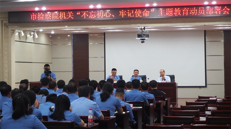 邢学军检察长从四个方面对主题教育进行了动员部署:一是认真贯彻习近平总书记重要讲话精神,深刻认识开展主题教育的重大意义。贯彻新时代党的建设总要求,落实以为中心的发展思想,推动各项决策部署在检察机关落地生根。二是紧密联系实际,牢牢把握主题教育的目标要求。牢牢把握主题教育的根本任务,“守初心、担使命、找差距、抓落实”的总体要求和“理论学习有收获、思想政治受洗礼、干事创业敢担当、为民服务解难题、清正廉洁作表率”的具体目标。三是认真抓好各项活动安排,着力推进主题教育取得实效。扎实开展学习教育,广泛深入调查研究,准确深刻检视问题,切实推进整改落实。四是切实加强组织领导,确保主题教育有序开展。强化责任担当,坚持领导带头,加强工作统筹,营造浓厚氛围。