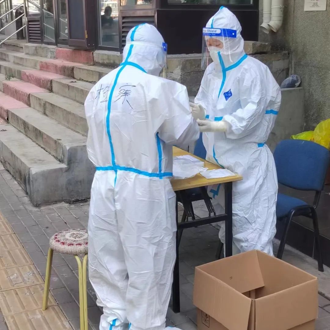 在给社区居民发放抗原试剂进行居家自测中,我俩反复地分类、确认后,将试剂交到每个居民手中。不少居民不知道试剂的作用和用法,我们就耐心地一一解释。烈日下,厚厚的防护服密不透风,反复说话导致口干舌燥,让人有虚脱的感觉,我俩互相鼓劲,一定要坚持下去!直到最后一个领取试剂的人离开……
