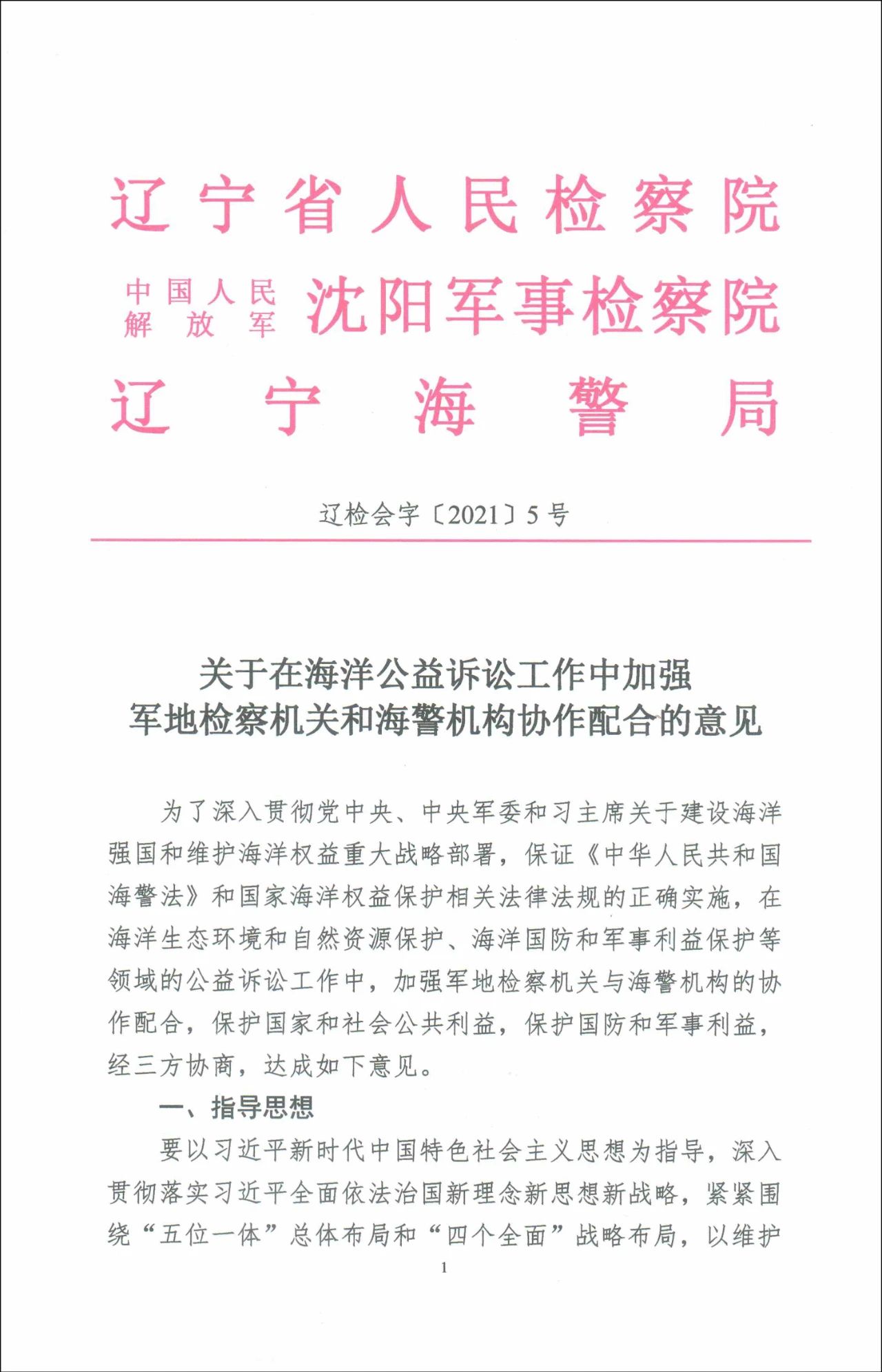 2021年5月19日,色花堂 、中国人民解放军沈阳军事色花堂、辽宁海警局正式签订《关于在海洋公益诉讼工作中加强军地检察机关和海警机构协作配合的意见》(以下简称《意见》),这标志着辽宁检察公益诉讼工作将迈向广阔的蓝色海洋。辽宁军地检察机关和海警机构在深入贯彻党中央、中央军委关于建设海洋强国和维护海洋权益重大战略部署、保证《中华人民共和国海警法》和国家海洋权益保护相关法律法规的正确实施、深入推进海洋生态环境和自然资源保护、海洋国防和军事利益保护等领域的公益诉讼工作,揭开了崭新的一页。