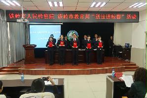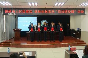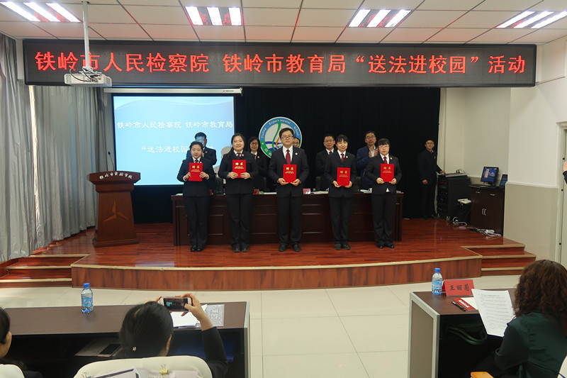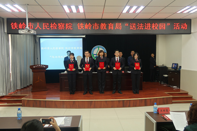 活动现场,铁岭市教育局党委委员宣读了《铁岭市检察院、铁岭市教育局关于开展“送法进校园”活动实施方案》,铁岭市教育局聘请铁岭市检察院十名干警为市直属各院校“法制副校长”并颁发聘任证书。与会领导为各院校赠送《铁岭市检察院“送法进校园”活动系列宣传课件》光盘。铁岭市未检处干警为在座师生讲授了一堂《防治校园欺凌》法制课。