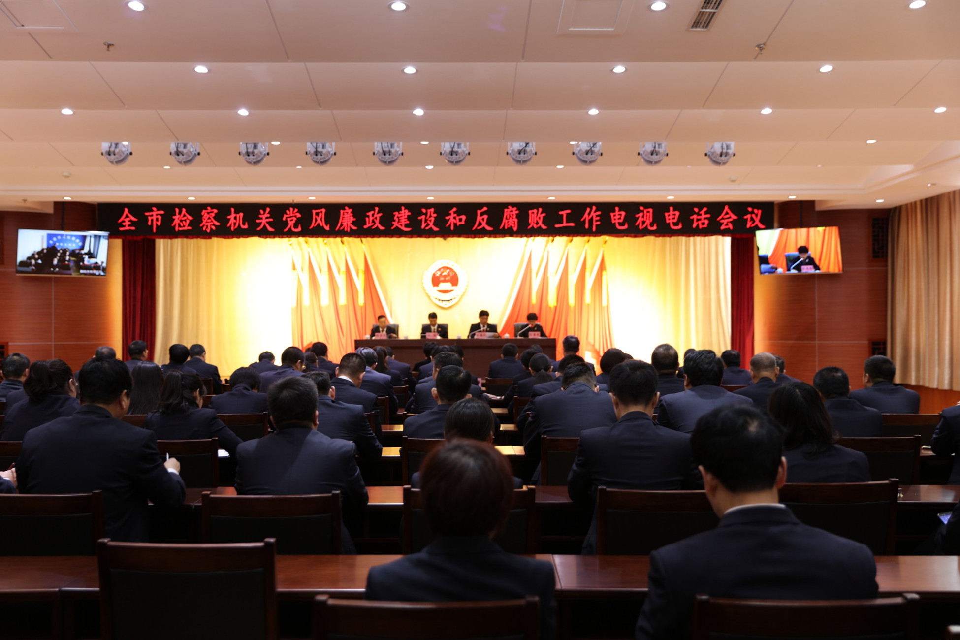 会议以电视电话会议形式在全市两级院同步召开,市院领导班子成员、市院机关全体干警在主会场参加会议,各基层检察院领导班子成员和全体干警在分会场参加会议。
