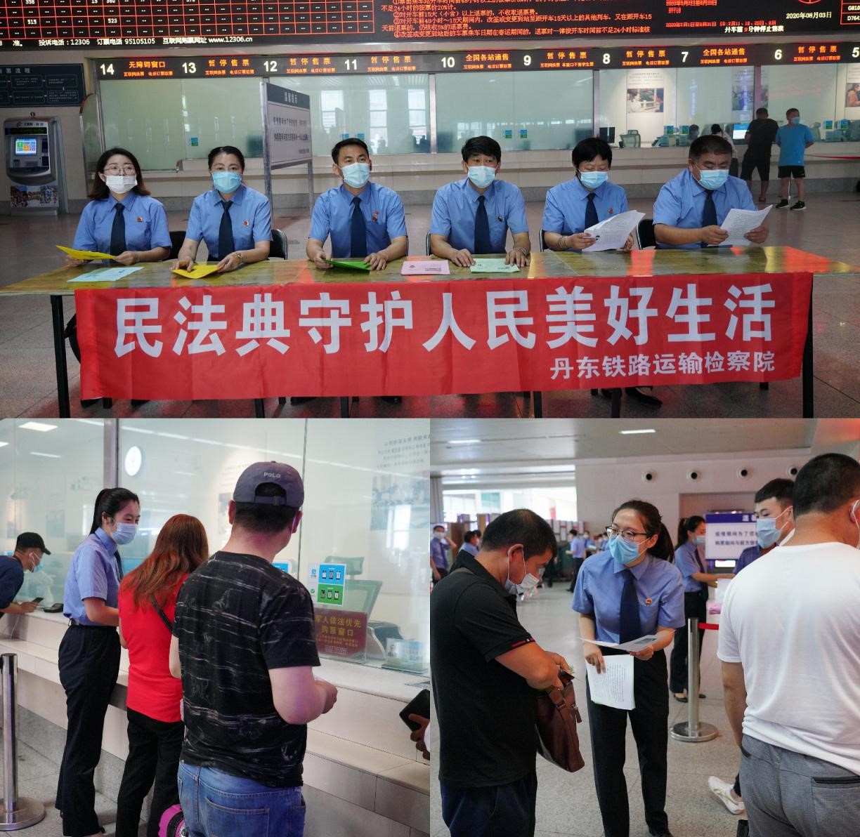 普法宣传,走进群众,践行为民情。8月3日,丹东铁检院开展了民法典宣传活动,全院干警走进丹东站进行普法宣传。干警结合民法典亮点,选取民法典涉及的热点问题,制作了通俗易懂、内容翔实的宣传单,为旅客进行细致讲解,提供法律咨询服务,耐心解答群众提出的问题,活动中共发放宣传手册和宣传单50余份,取得了良好的法治宣传效果。