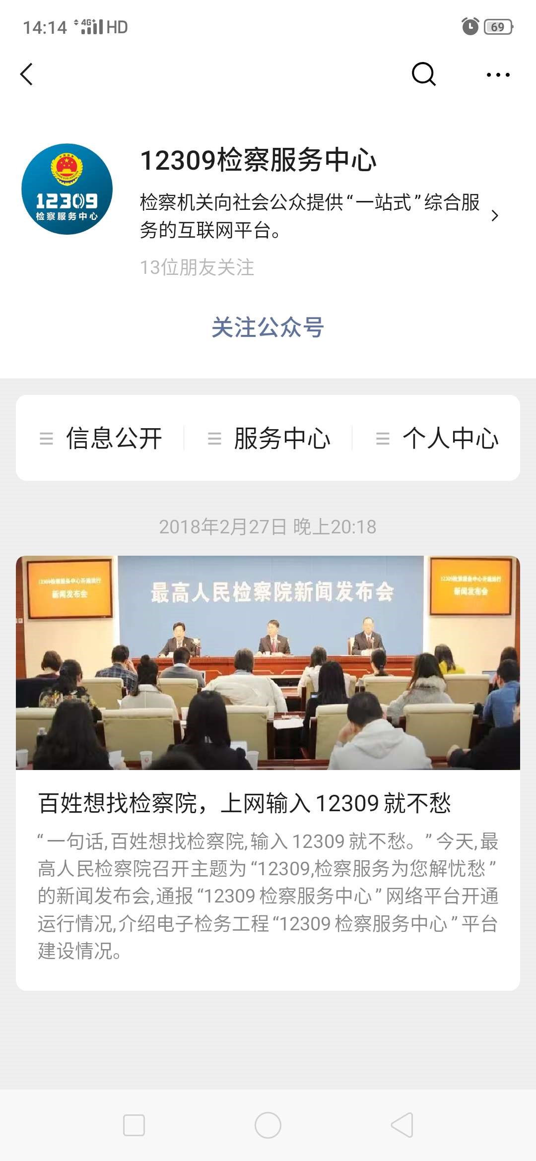 用户搜索微信公众号“12309检察服务中心”(如图1-1),点击“关注公众号”;或者直接扫描12309检察服务中心二维码关注公众号(如图1-2):