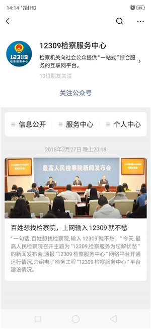 12309中国检察网是检察机关向社会公众提供”一站式”综合服务的互联网平台,设有专门的律师服务模块,为律师提供阅卷申请预约、案件进展情况查询及推送等服务。律师可登录“12309中国检察网”(www.12309.gov.cn),也可在手机上关注“12309检察服务中心”微信公众号或下载“检察12309”APP,自助进行注册和案件绑定操作。推荐使用微信公众号方式登录,具体操作方法如下: