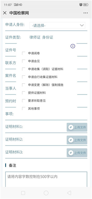 进入注册页面(如图2-4),填写姓名、手机号码等信息,获取并填写手机验证码,将“律师身份”处默认的“否”,改成“是”,原有的注册信息下方会增加律师的注册内容(如图2-5),选择相关地区和检察院,上传认证材料,点击【注册】按钮即完成注册申请。