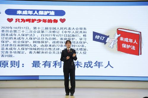 此次法治课以“《新未成年人保护法》亮点浅析”为题,从发生在学生身边的典型案例出发,对如何防止校园欺凌、文明安全上网以及如何学会保护自己进行了深入浅出地讲解,让学生明白了哪些行为是违法犯罪以及违法犯罪行为的恶劣后果。检察官跟学生们说案例、讲启示、谈思考,希望同学们凡事三思而后行,做到心有敬畏、行有所止,做新时期学法、守法、懂法、用法好少年。