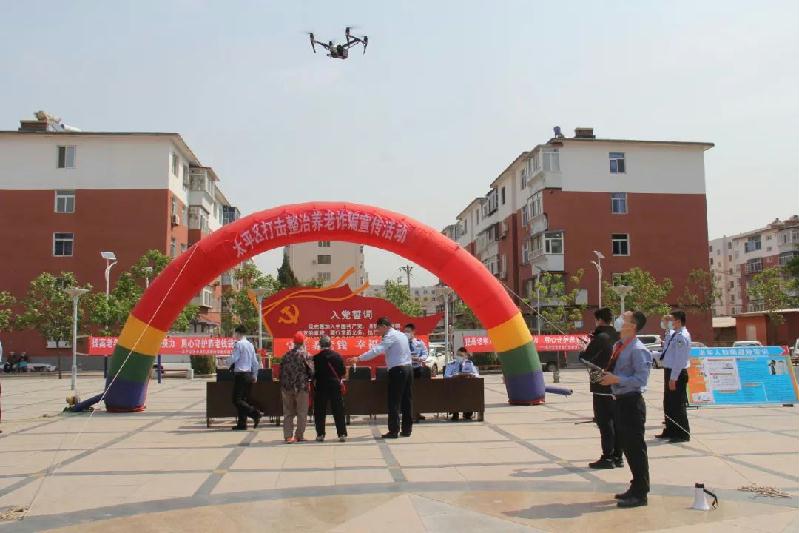 “假冒国家机关领导、亲友,银行等以虚构事实或隐瞒真相的方法,骗取数额较大的公私财物的犯罪行为,又称非接触性诈骗……”广场上空突然传来了宣传语音,人们纷纷抬头观望,原来是检察干警正在用无人机广播防骗知识。