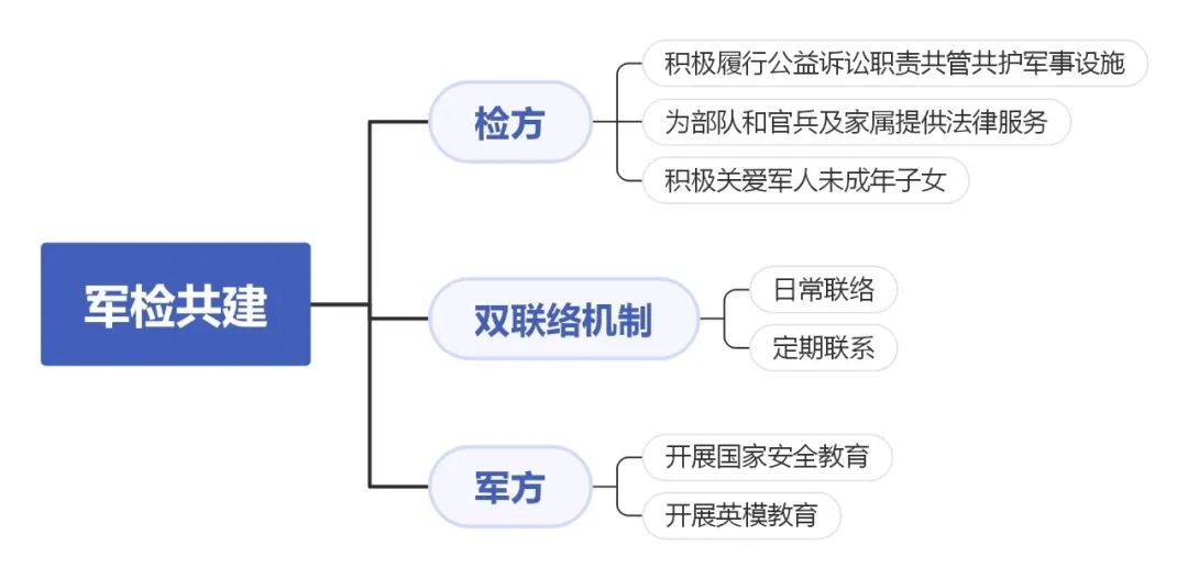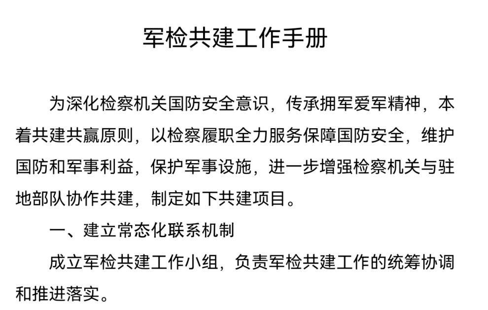 经共同商定,双方出台了《“军检共建”工作手册》,建立了由区武装部、驻军某部、区检察院共同组成的“军检共建”工作小组及联络机制,把“军检共建”工作长期推进下去。