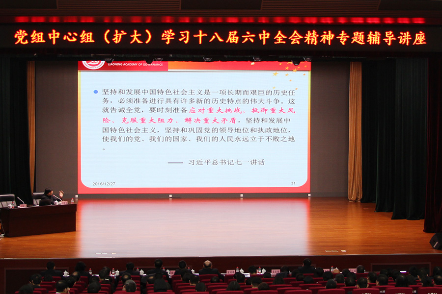 院在机关礼堂举行学习贯彻党的十八届六中全会精神宣讲报告会。辽宁省委宣讲团成员、辽宁行政学院党委书记、常务副院长邓泉国以“全面开启从严治党新征程”为主题,围绕深入学习领会党的十八届六中全会精神,宣讲了六中全会的重大意义,解读了关于坚定不移推进全面从严治党、关于全面加强和规范党内政治生活、关于全面落实党内监督责任的深刻内涵。这次宣讲报告会,系统全面地讲解了党的十八届六中全会精神,为广大机关干警进一步加深对六中全会精神的理解掌握,提供了有益帮助。全省检察机关将按照省委的部署要求,深入学习领会党的十八届六中全会精神,自觉在思想上、政治上、行动上同以习近平同志为核心的党中央保持高度一致,坚决把党中央全面从严治党各项部署要求落实到检察工作中,切实发挥检察机关职能作用,为辽宁扎实推进振兴发展全面建成小康社会提供坚强保证。