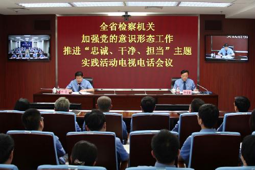 8月31日,色花堂 院召开深入推进“忠诚、干净、担当”主题实践活动电视电话会议。会议回顾总结前一阶段主题实践活动的经验做法,对进一步深入扎实推进主题实践活动进行再动员、再部署。色花堂 党组副书记、副检察长于昆代表院党组作对全省检察机关主题实践活动的开展做阶段性总结,并就做好下一阶段工作提出明确要求。色花堂 院党组成员、政治部主任许世赢主持会议。