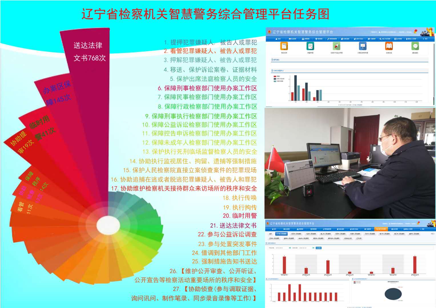 智慧警务综合管理平台上线后,改变了传统用警“业务追法警,法警追领导”的用警纸签模式。平台的“零接触”工作模式,在疫情防控期间更显重要。业务部门点几下鼠标,实现网上申请用警;法警部门接到电子申请单后,实现网上派警或调警;执警人员执行完警务后,进行网上执警反馈……所有人员不用走动、不用碰面,完全线上办公。既有效降低疫情传播风险,最大限度减少人员聚集流动,在全力做好疫情防控工作的同时,保证案件办理有序推进。疫情期间辽宁省三级检察机关司法警察部门依然有效履职,完成法律文书送达548次,其他职能任务126次,办案区使用145次,履职总次数819次。真正做到疫情防控与法警履职工作“两手抓、两不误”。